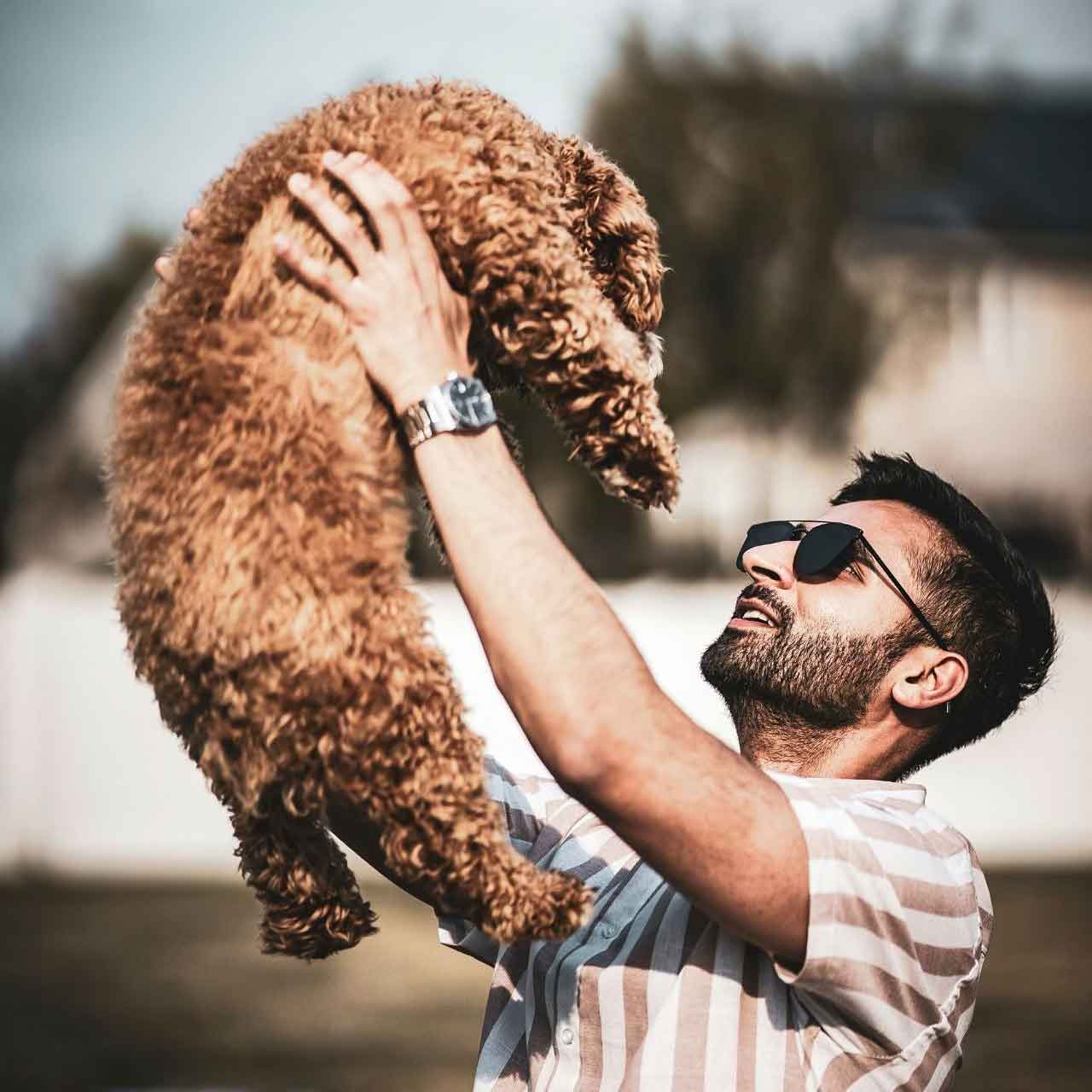 Photo caption: There are so many dog lovers in California! Male pet parent holding up a Cockapoo puppy in the sun, Photo Credit: Jain Amsheth on Unsplash.